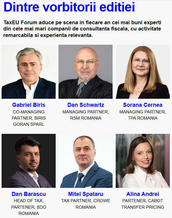 Fii primul care afla despre agenda, vorbitorii si surprizele editiei. Asigura-te ca adresa noastra contact@taxeu.ro este in Contactele tale. Ramai aproape de noi si pe site-ul evenimentului, pe pagina de Facebook, dar si pe LinkedIn.